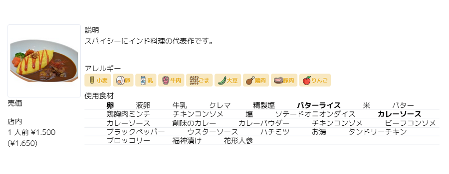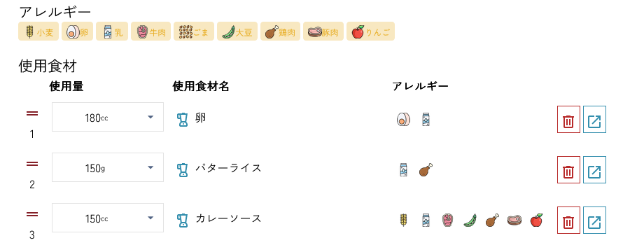 アレルゲンを食材に関連付けることで、レシピに食材を挿入すると自動的に選択されるようになります。